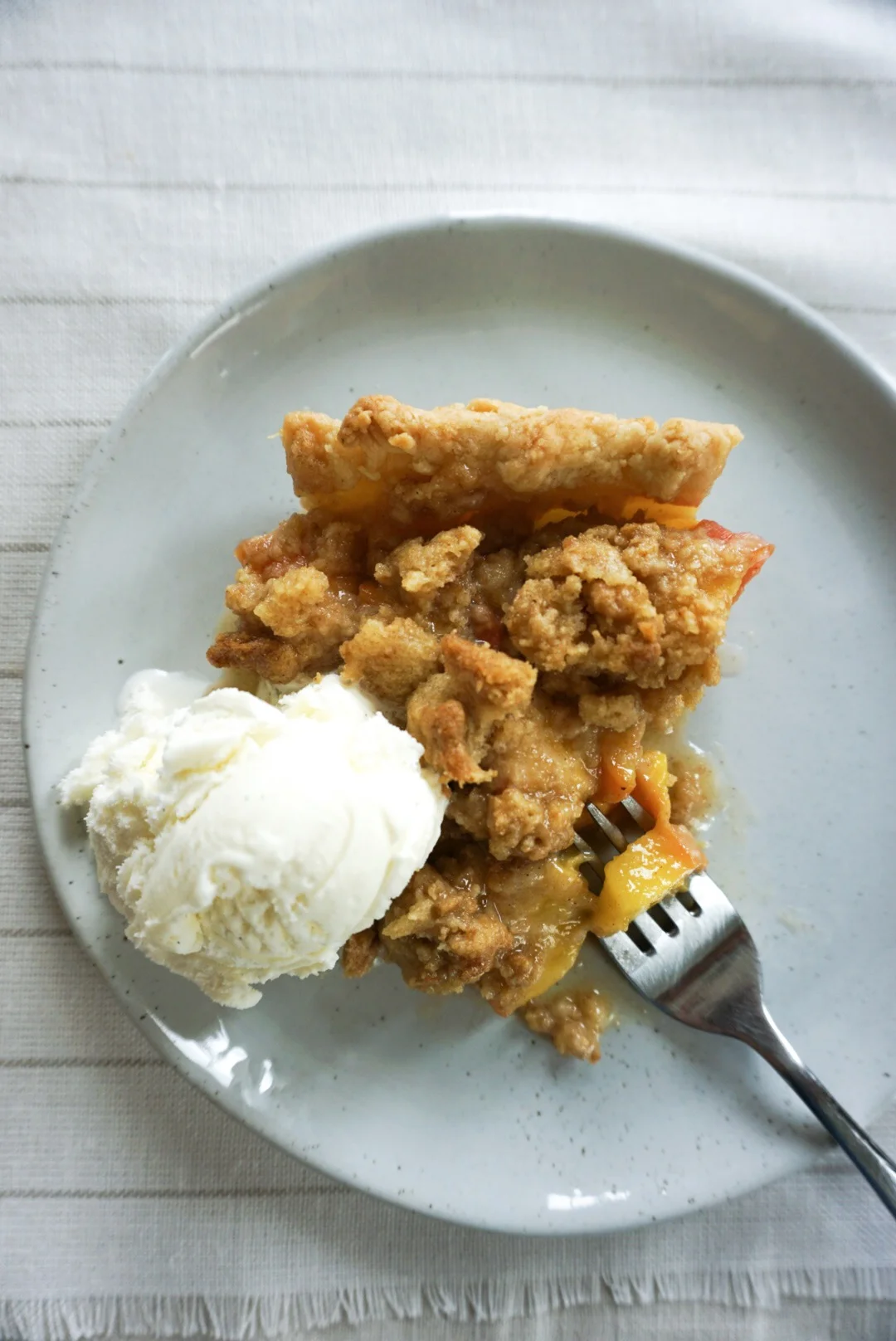 Preheat oven to 350. In large bowl combine peaches (I like to leave the skins on. I think it gives more flavor and better color), sugar, corn starch, lemon juice, cinnamon, nutmeg and salt. let sit and let the juices release! Next made the crumble. Combine the flour, graham crackers, brown sugar and baking powder. Mix well. Using pastry blender or a fork, blend in the butter until the mixture is crumbly. Drain peach mixture reserving about 1/4 cup to add back once you fill the pie. Now time to assemble the pie! Roll out pre-made pie dough and place into a 9 inch pie plate. Add the peach filling and 1/4 cup reserved liquid and top with the crumble. Bake for 40-50 minutes. *check at 40. Let the pie cool then slice and serve with vanilla ice cream!